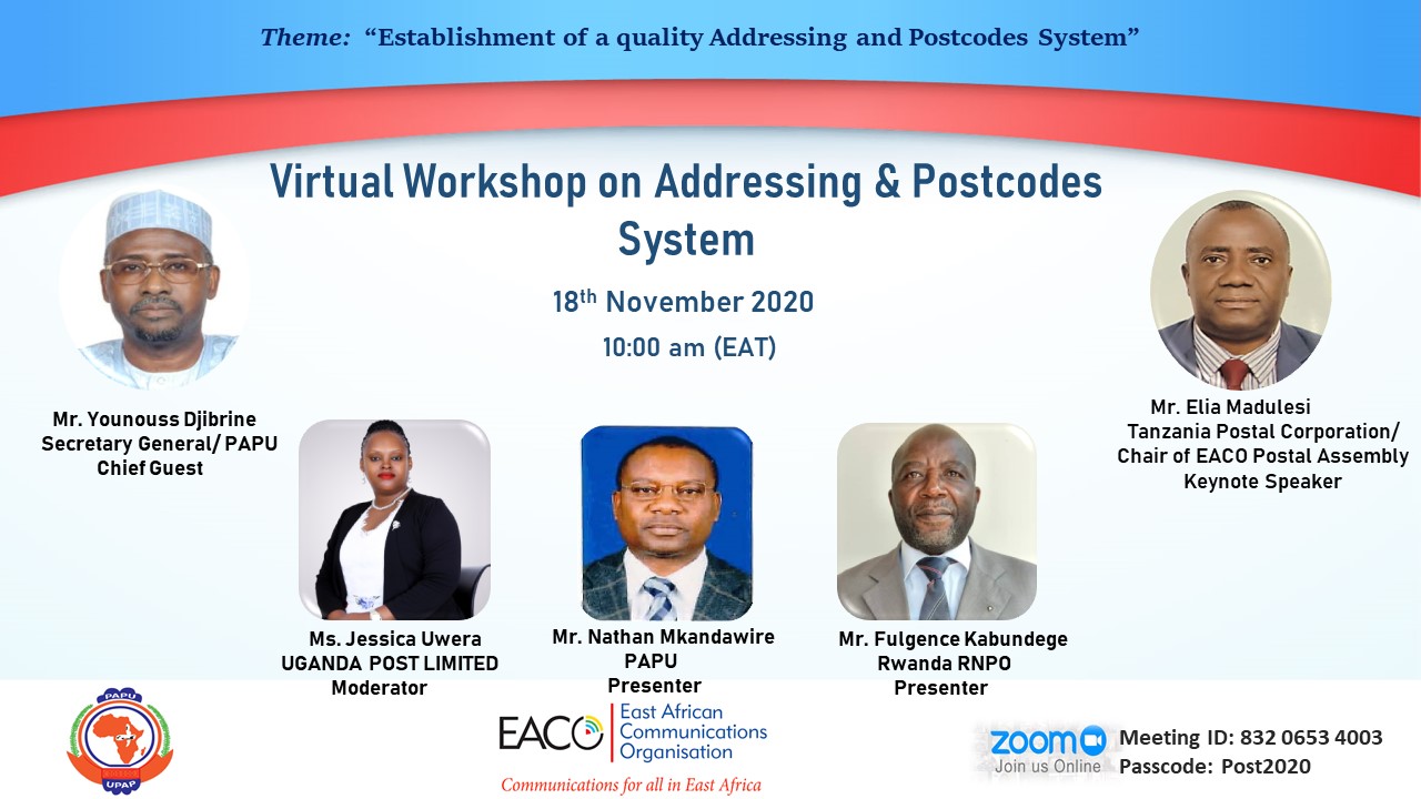 On 18th November 2020, The East African Communication Organization (EACO) together with Pan African Postal Union (PAPU) Organized a virtual workshop on Addressing and Postcodes system.
