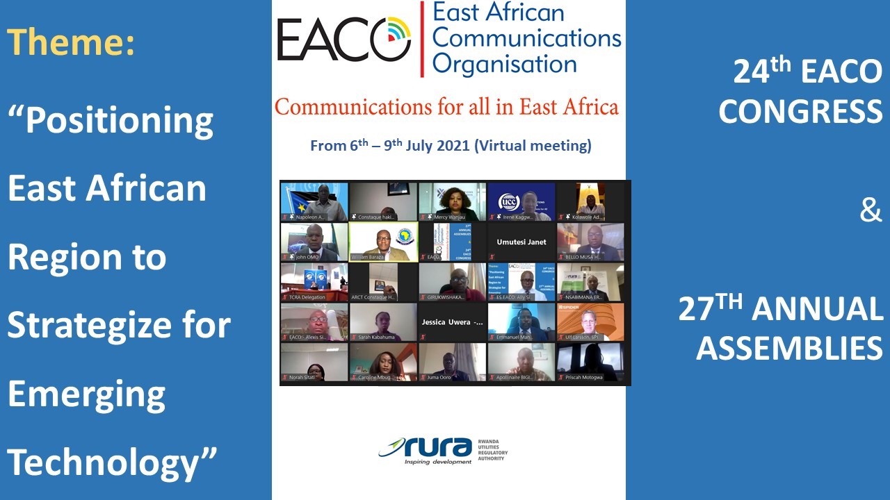 From 6th to 9th July 2021, we concluded a week-long virtual EACO Congress and our 27th annual Meeting of Assemblies, held under the theme of Positioning East African Region to Strategize for Emerging Technologies. Both events were hosted by Rwanda Utilities and Regulatory Authority (RURA).